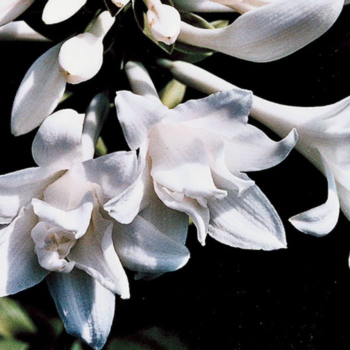 A double-flowered selection of the 'August Lily'. The true highlight of this hosta is the elegance and superb fragrance of the large, double white flowers that bloom from August to September. Leaves are shiny light green, 11 inches long, with a smooth texture. Spreads up to 36 inches wide. Ht: 18".