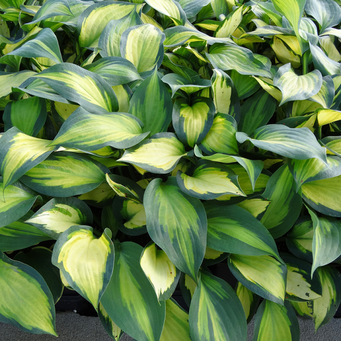 (PP24001) You can expect strong, vigorous growth from this bright, eye-catching variety. The leaves are large and feature blue-green margins surrounding vibrant centers that begin yellow-orange and fade to white as the season progresses. Lavender flowers appear in early summer on plants that grow up to 3' wide. Zones: 3-8. Ht: 18-22". BR