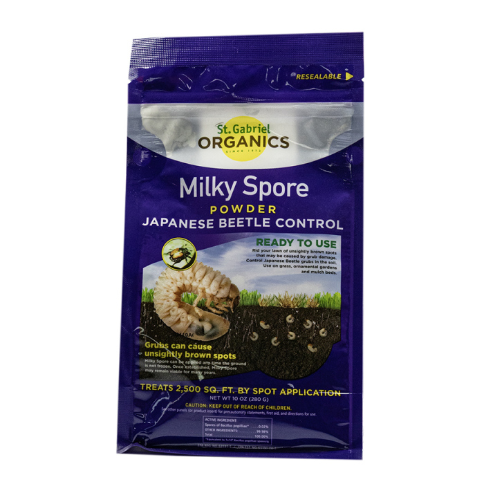 Natural bacteria controls Japanese beetles permanently. Apply this powder to your lawn where white grubs (beetle larvae) feed on grass roots. The number of beetles will drop the next season. Only one application is necessary and after killing the initial grubs the spores actually multiply in the soil, becoming even more effective over time and remaining viable for many years. Compatible with lawn chemicals and harmless to people, pets, earthworms and insects other than white grubs. May be applied any time soil is warm. 10 oz. bag treats 2500 sq. ft.